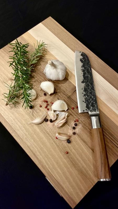 Varnost materiala: Naša deska za rezanje je izdelana iz oreha, z dodatkom češnje in javorja. Čeprav smo sprejeli ukrepe za zagotovitev varnosti pri uporabi, je nujno, da pred vsako uporabo desko natančno pregledamo glede morebitnih napak ali poškodb. Če opazite kakršne koli težave, takoj prenehajte z uporabo.