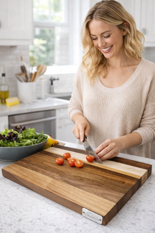 Varnost materiala: Naša deska za rezanje je izdelana iz oreha, z dodatkom češnje in javorja. Čeprav smo sprejeli ukrepe za zagotovitev varnosti pri uporabi, je nujno, da pred vsako uporabo desko natančno pregledamo glede morebitnih napak ali poškodb. Če opazite kakršne koli težave, takoj prenehajte z uporabo.